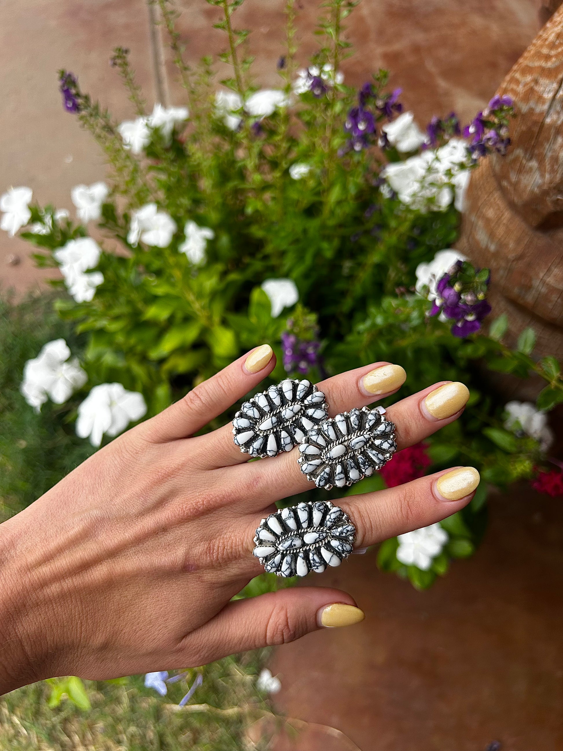 Behold, a masterpiece by Juliana William, showcasing a gorgeous White Buffalo stone. This ring captures the stone's unique beauty.
