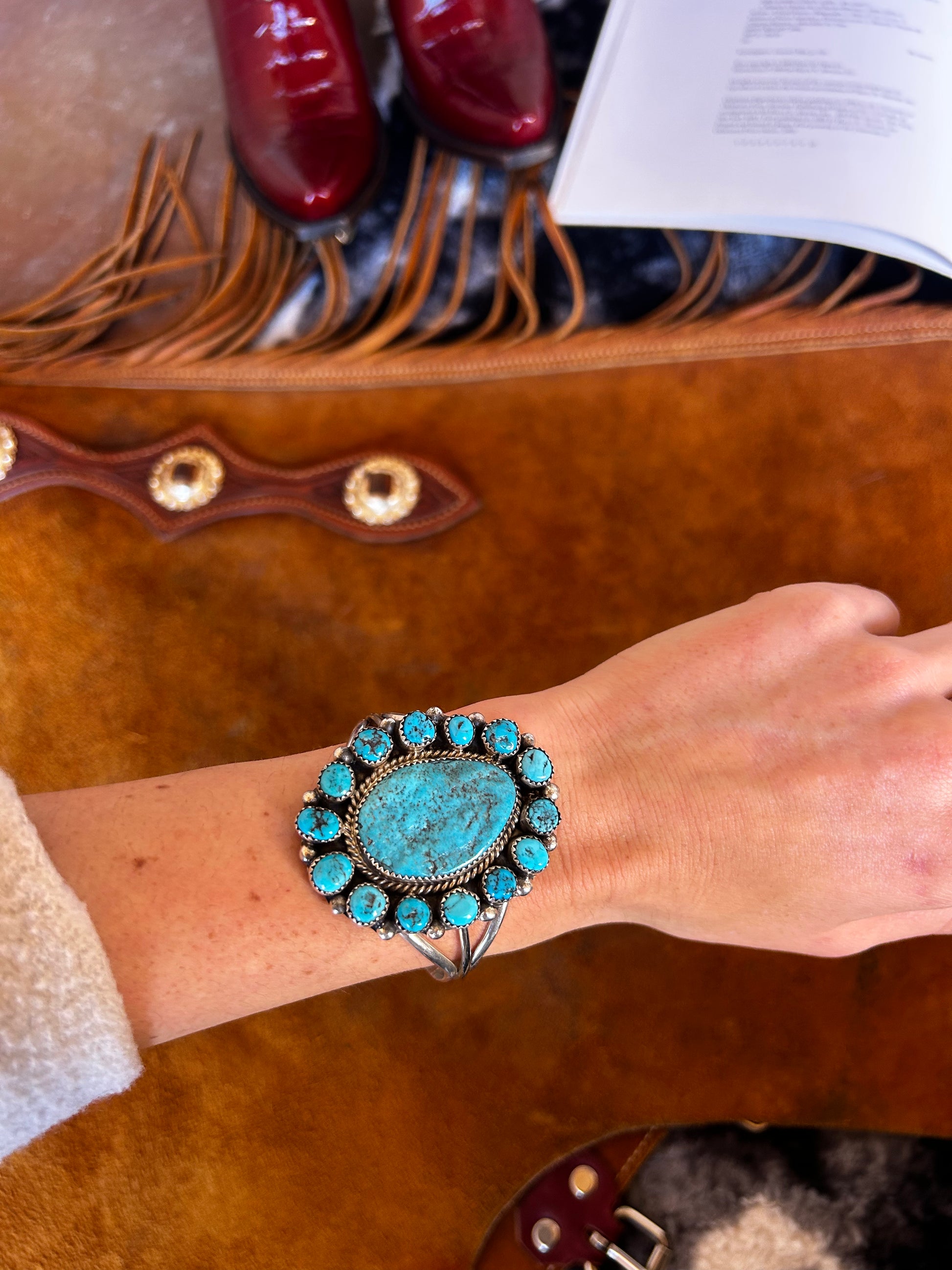 This Navajo-made bracelet showcases the vibrant blue of Kingman turquoise, celebrated for its rich color and natural matrix patterns. Set in gleaming sterling silver. The bracelet reflects both traditional craftsmanship and elegance.
