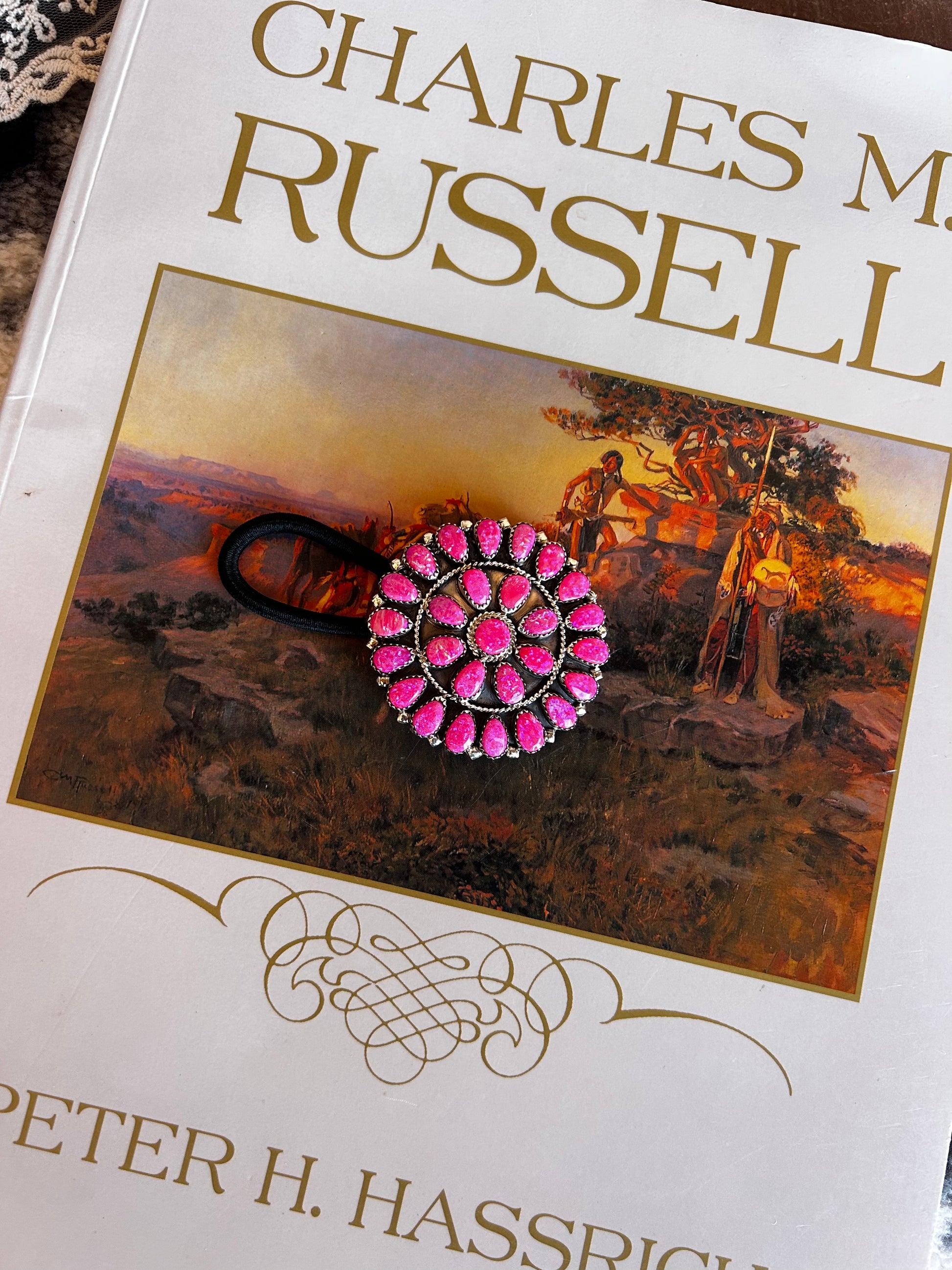 This handcrafted Navajo hair tie features a striking circular design with tear-shaped pink stones meticulously arranged to catch the eye.
