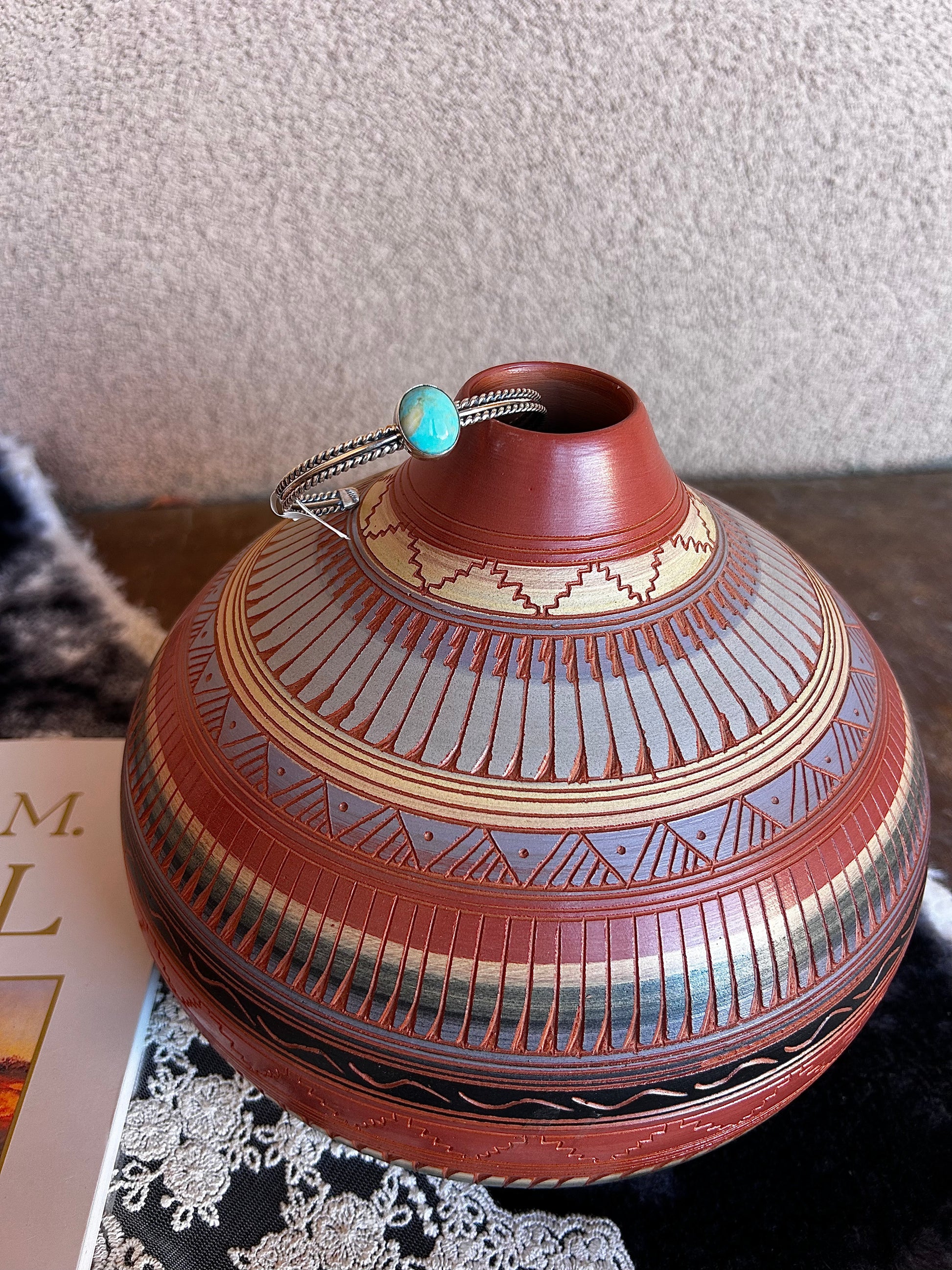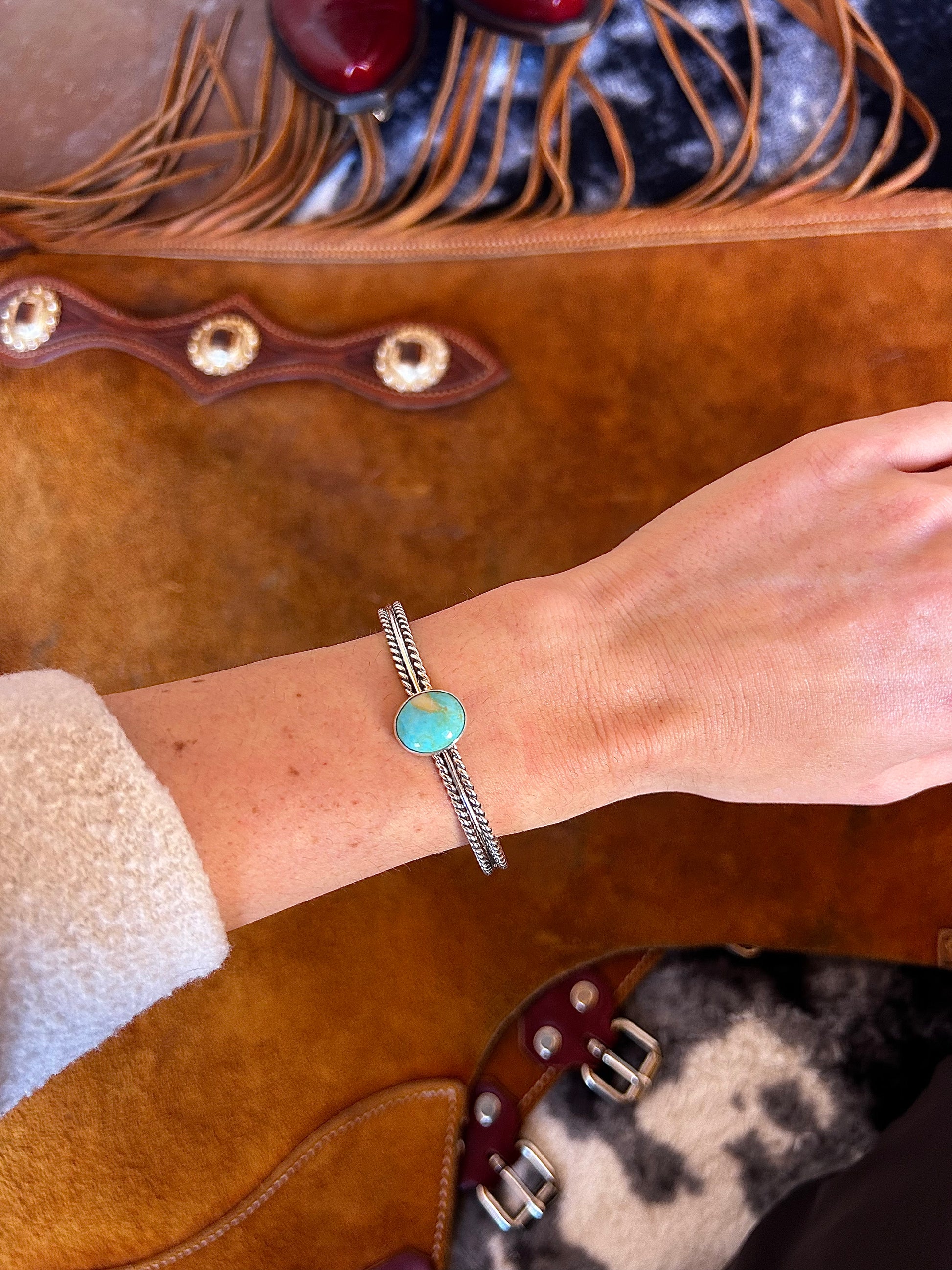 The sterling silver setting is polished to a brilliant shine, ensuring the bracelet catches the light and draws attention to the captivating turquoise. This piece combines rustic charm with elegant design making it a perfect accessory for adding a touch of southern flair to any outfit!