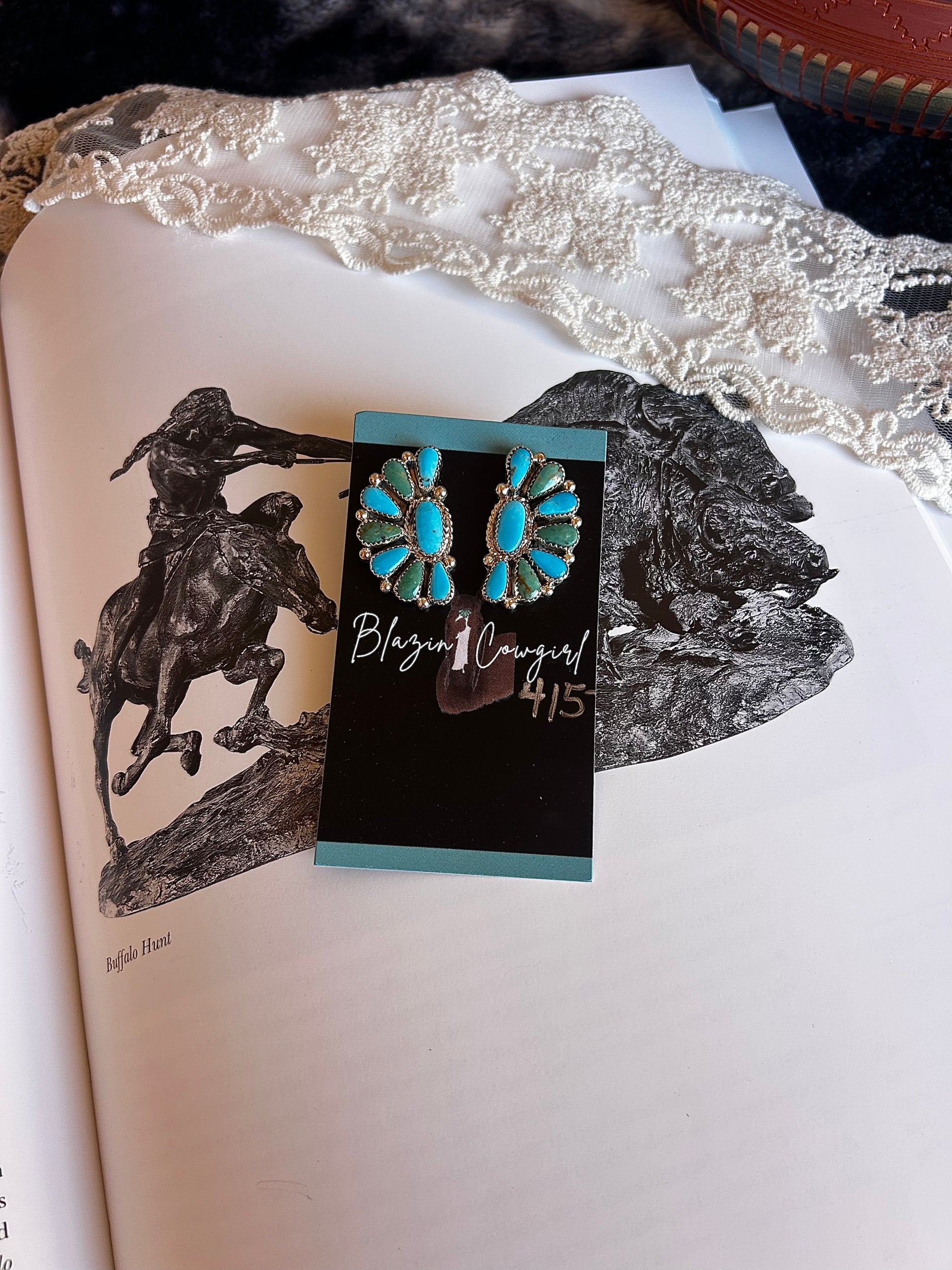 These beautiful half-moon shaped earrings showcase a mesmerizing contrast of Kingman turquoise and vibrant green turquoise. Each stone is carefully selected and expertly set, creating a harmonious balance of color and texture.