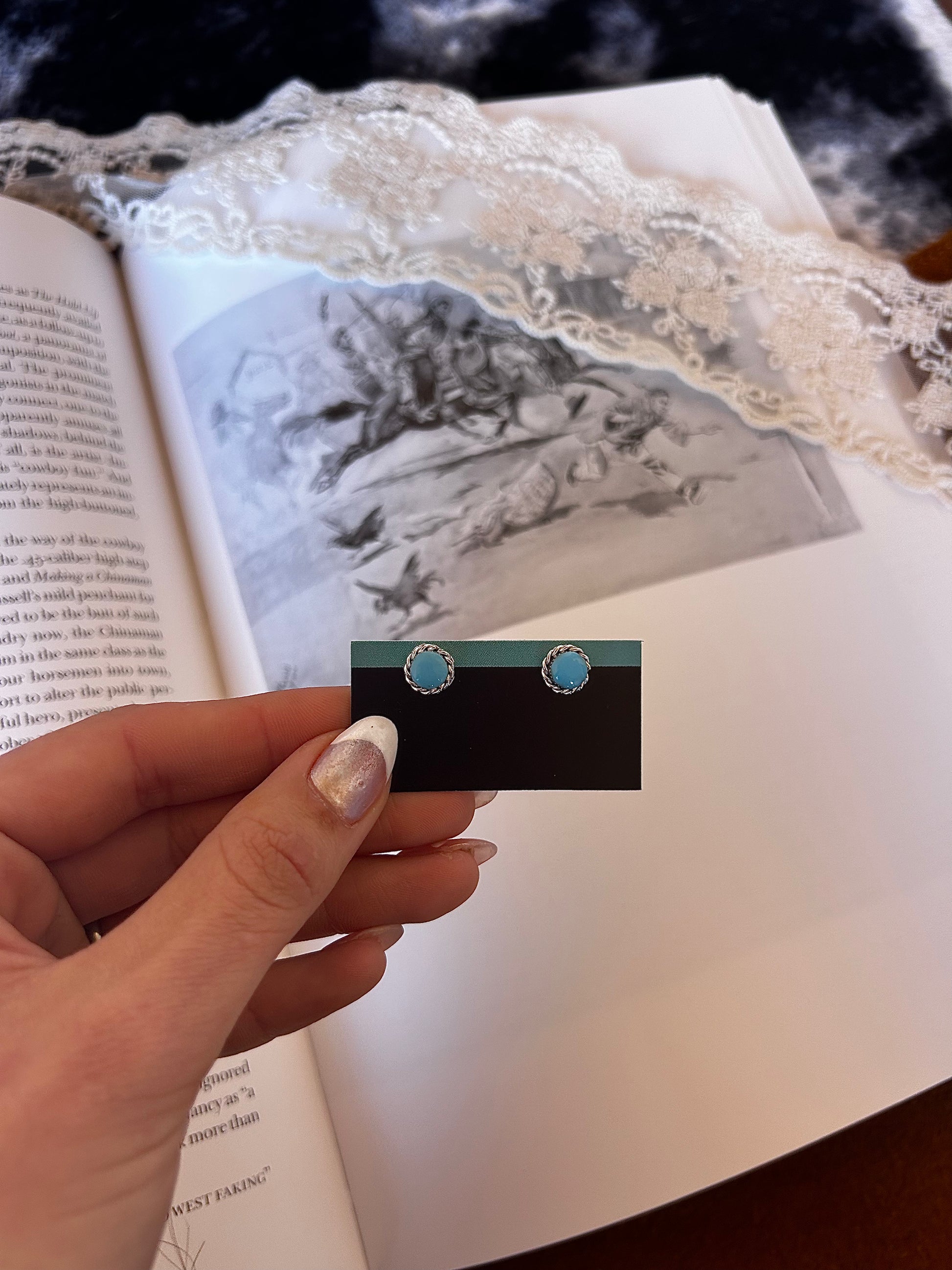 Elevate your style with our Round Rope Studs. These classy earrings feature genuine Kingman turquoise, renowned for its vivid blue hues and unique veining. Skillfully set in sterling silver with a delicate rope design, these studs blend classic elegance with a touch of Southwestern flair.