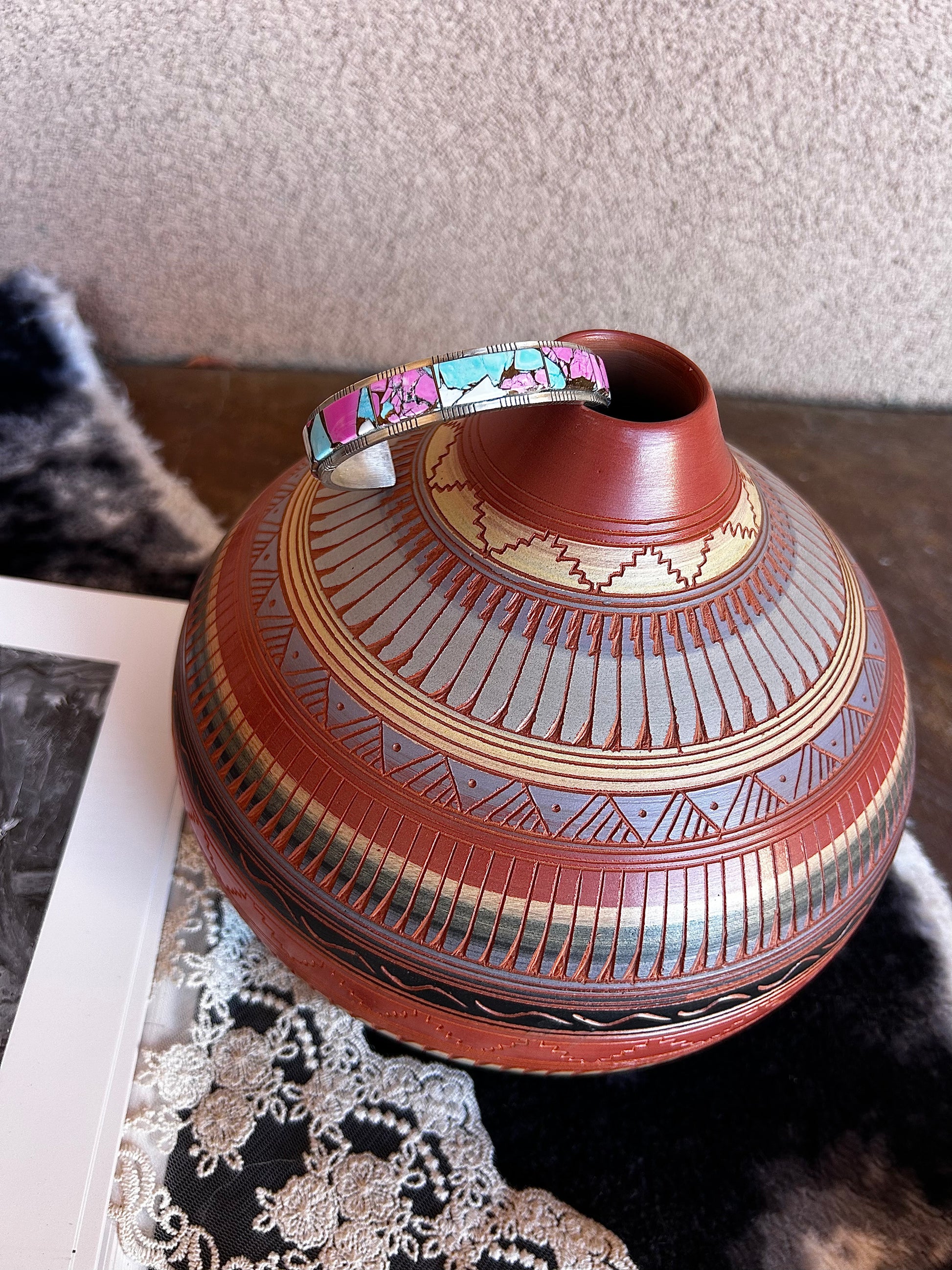 This Cotton Candy Cuff is a whimsical blend of color and craftsmanship. Crafted from sterling silver. The cuff features a stunning cotton candy stone, a mosaic of soft pinks, blues, and whites that evokes the sweet treat it's names after.