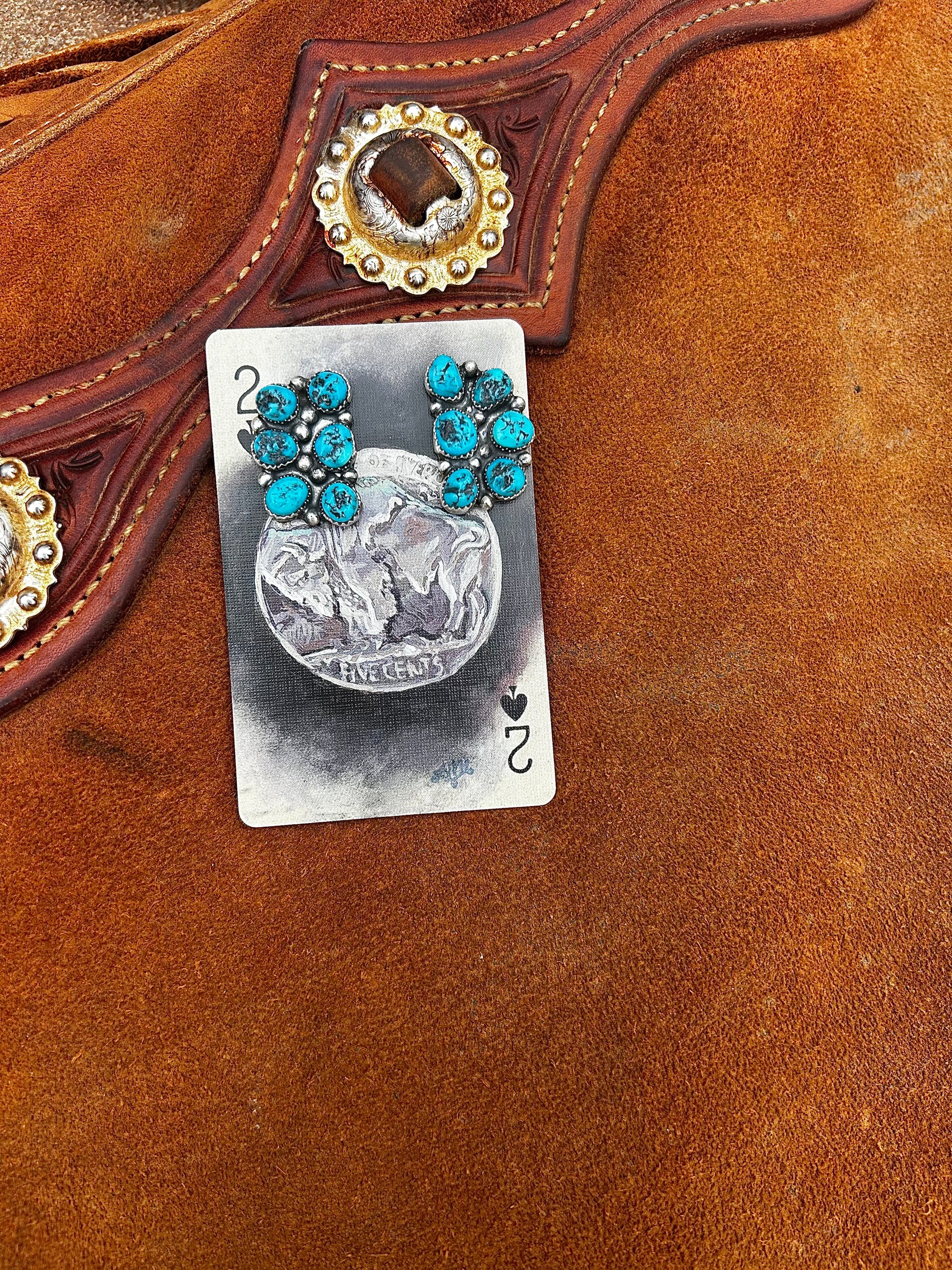 Each earring showcases the vibrant blue hues that Kingman Turquoise is known for, making them a unique and elegant statement piece!