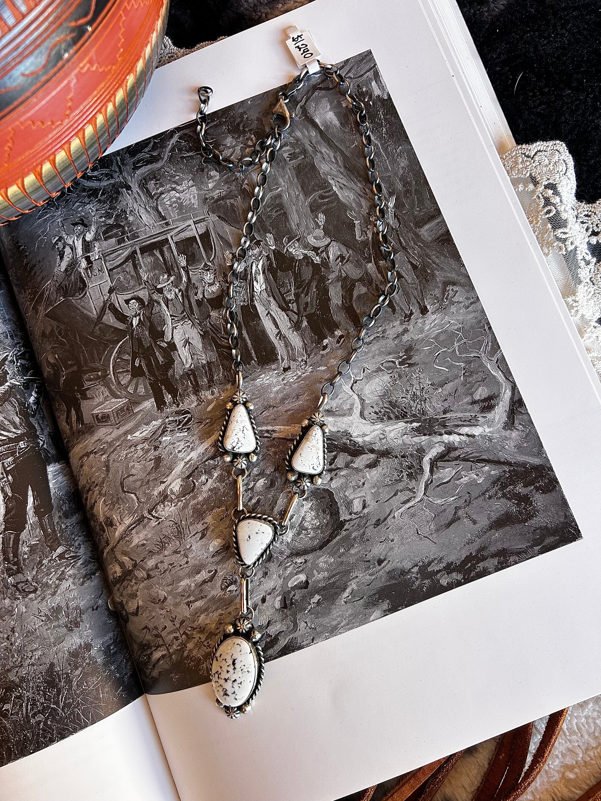 This White Buffalo dream set, crafted by Navajo artist Augustine Largo, features a 20" sterling silver necklace with an adjustable chain and matching earrings.